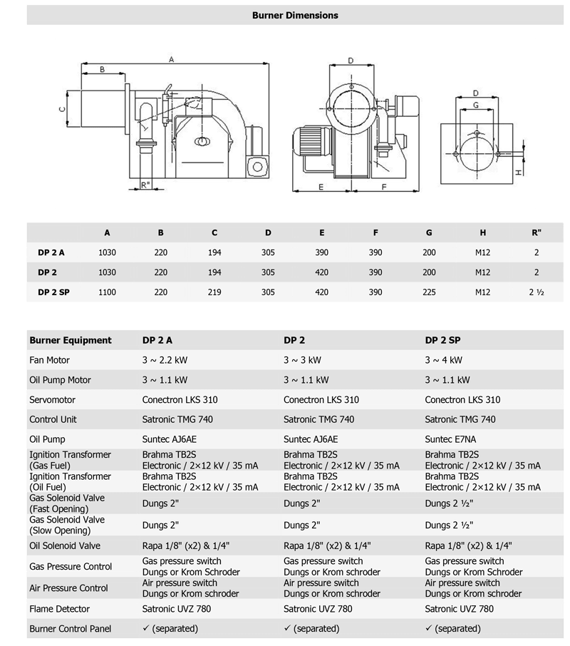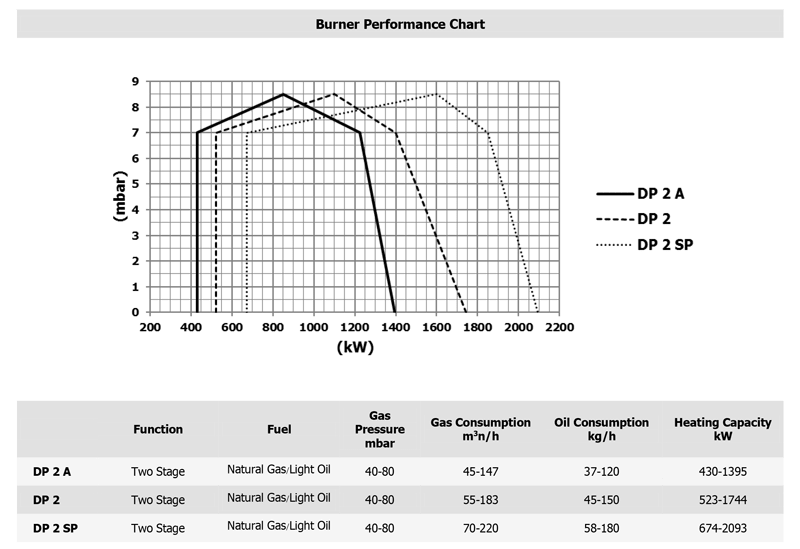 Fuel: Natural Gas/Light Oil. Gas Pressure 40-80 mbar. Gas consumption 45-183 m3n/h. Oil consumption 37-150 kg/h. Heating capacity from 430-1744 kW.