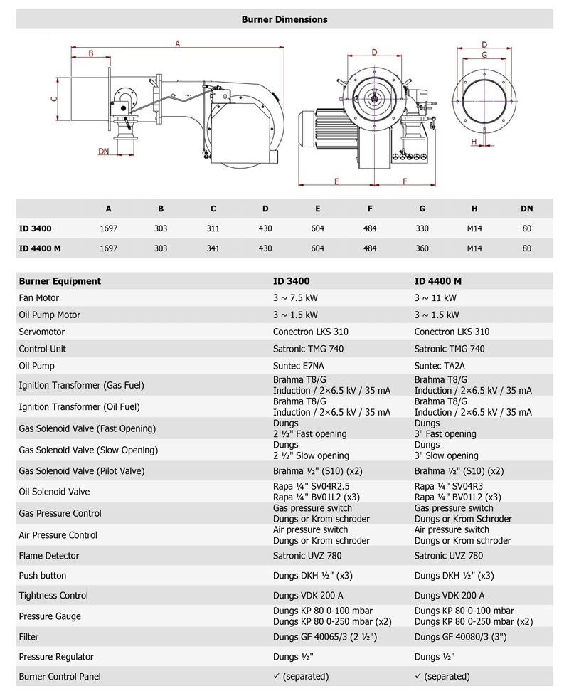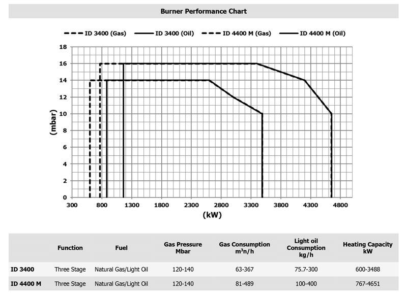 Fuel: Natural Gas/Light Oil. Gas Pressure 120-140 mbar. Gas consumption 63-367 m3n/h. Oil consumption 75.7-300 kg/h. Heating capacity from 600-3488 kW.