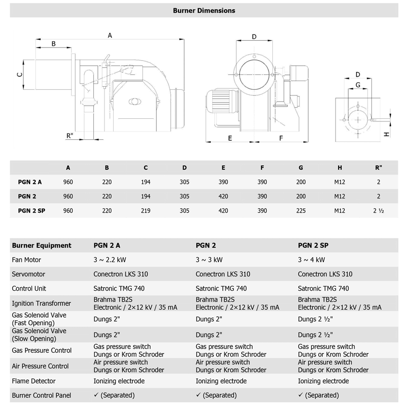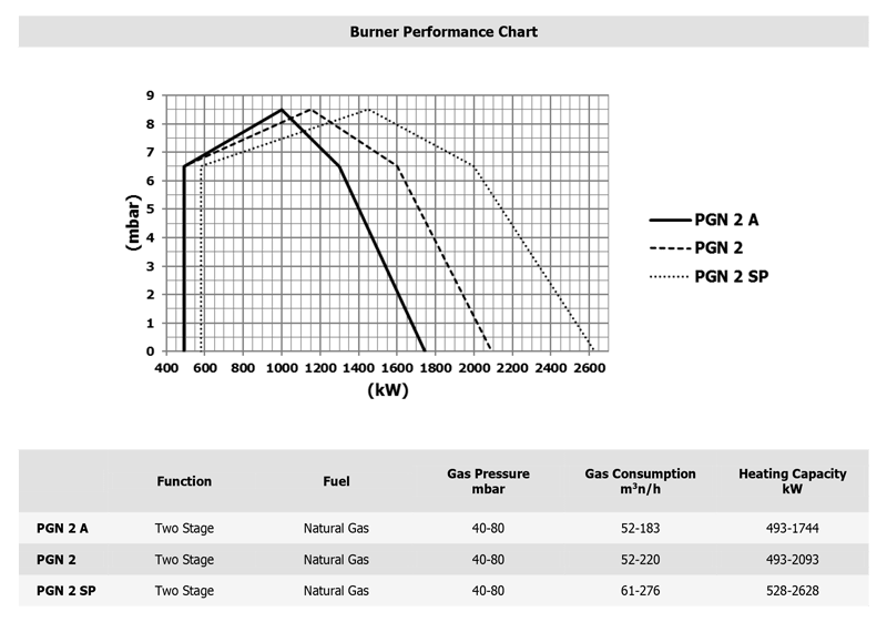 Gas Pressure 40-80 mbar. Gas consumption 52-183 m3n/h. Heating capacity from 493-1744 kW.